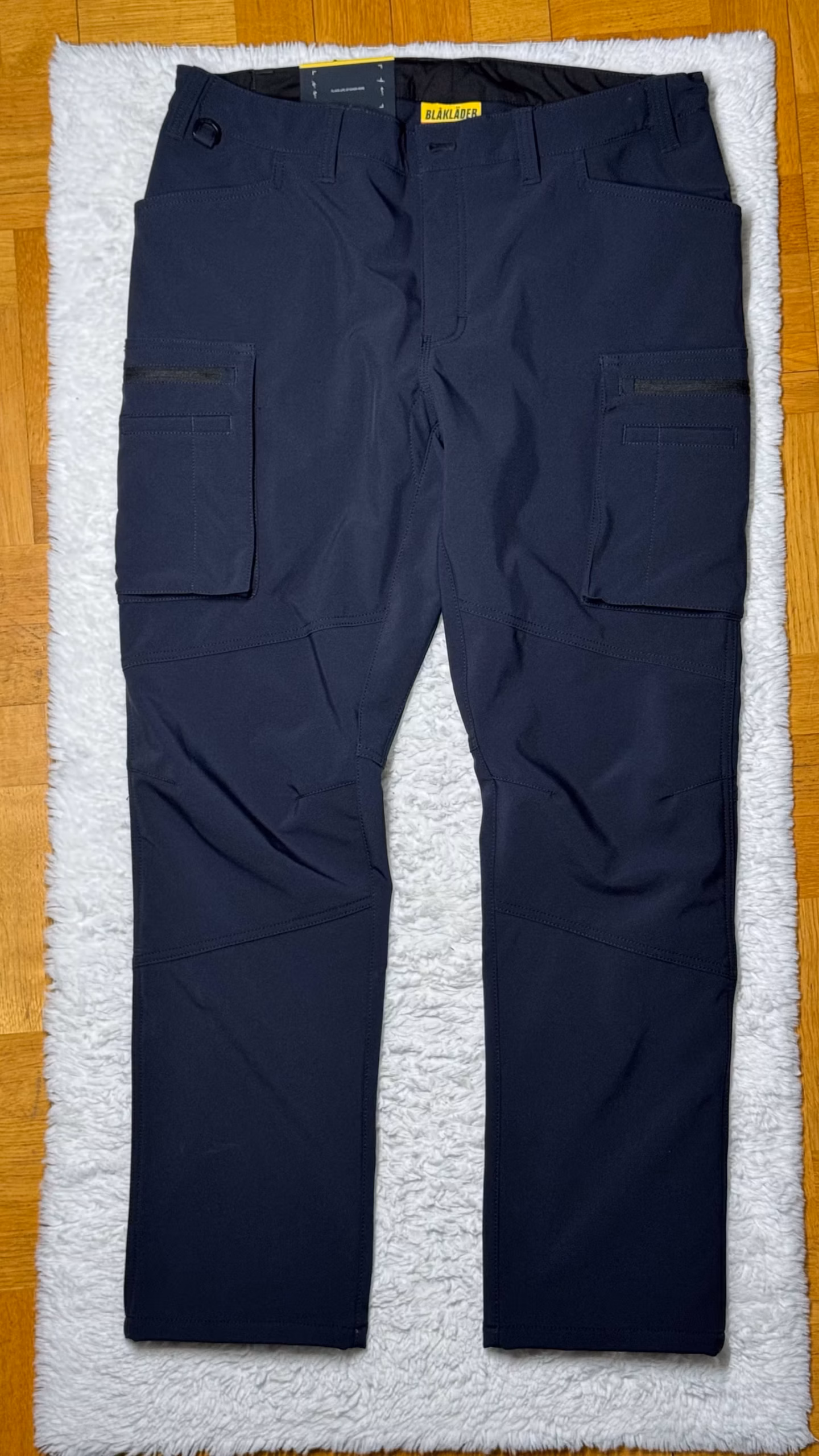 housut, koko UK 18S (DE D22, FR 46C). Väri tummansininen. Housuissa on sivutaskut lahkeissa. Sopivat arki- tai ulkoilukäyttöön käyttäjän tarpeen mukaan.