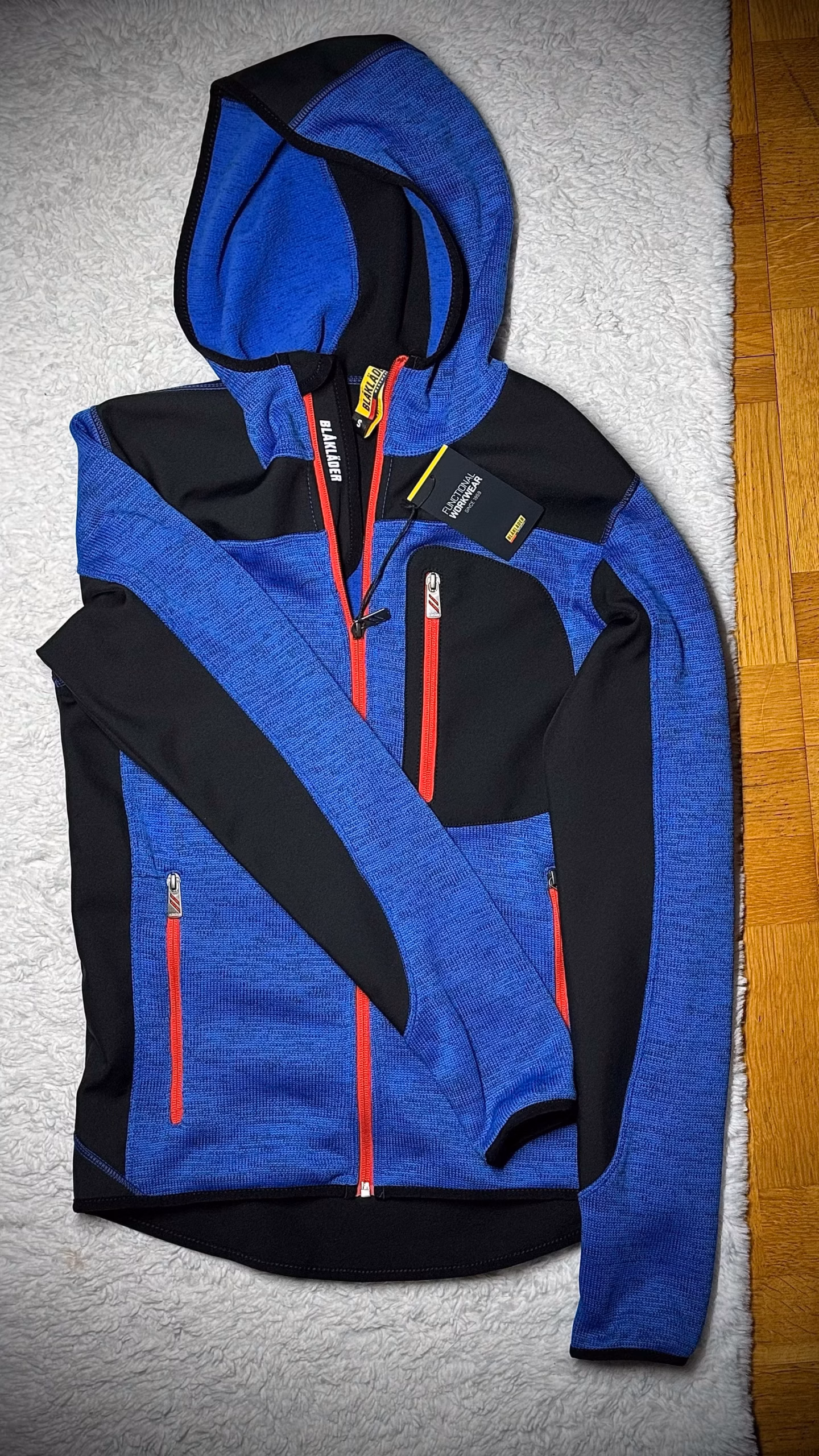 huppari. Väri sininen ja musta, punaiset vetoketjut. Edessä useita vetoketjutaskuja ja vetoketjukiinnitys. Hupullinen malli ulkoiluun ja vapaa-aikaan.