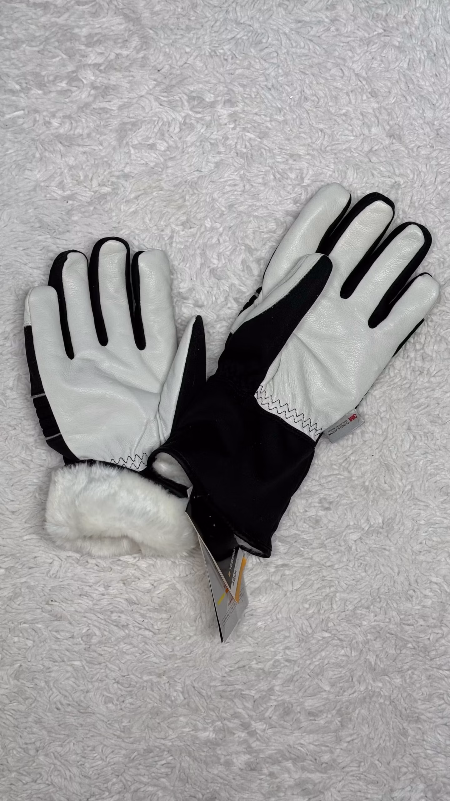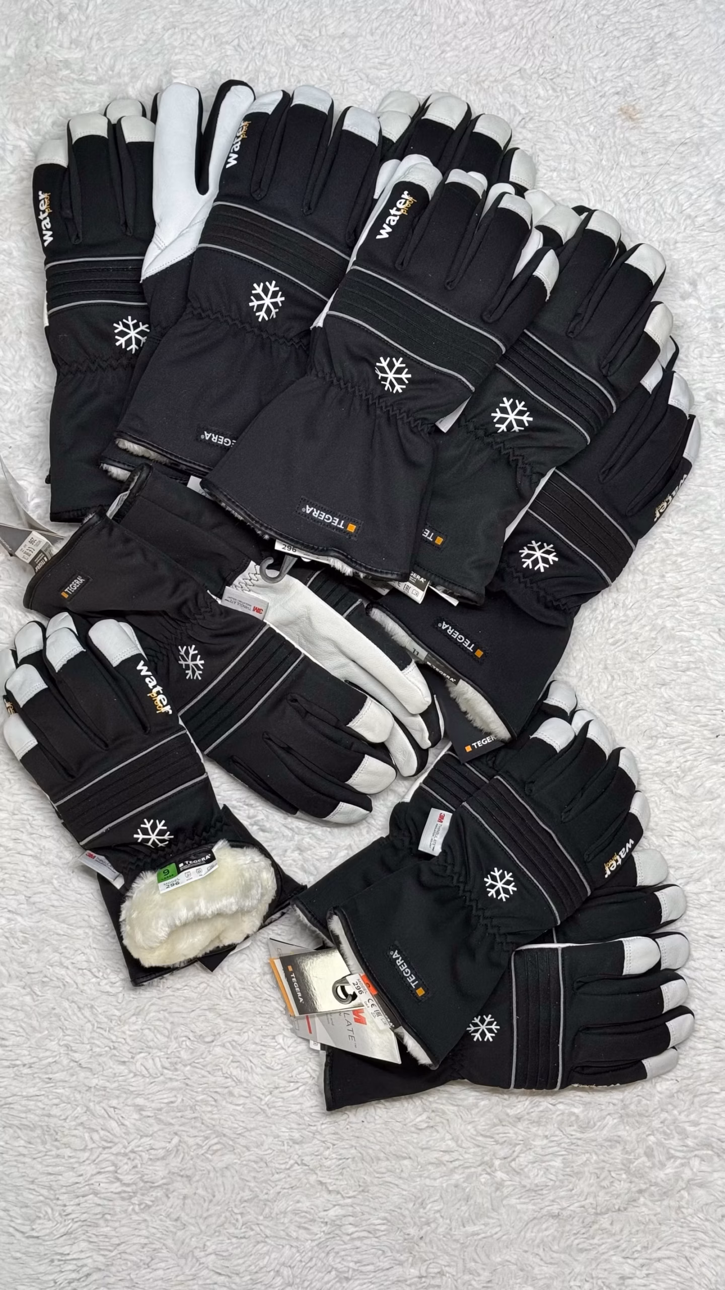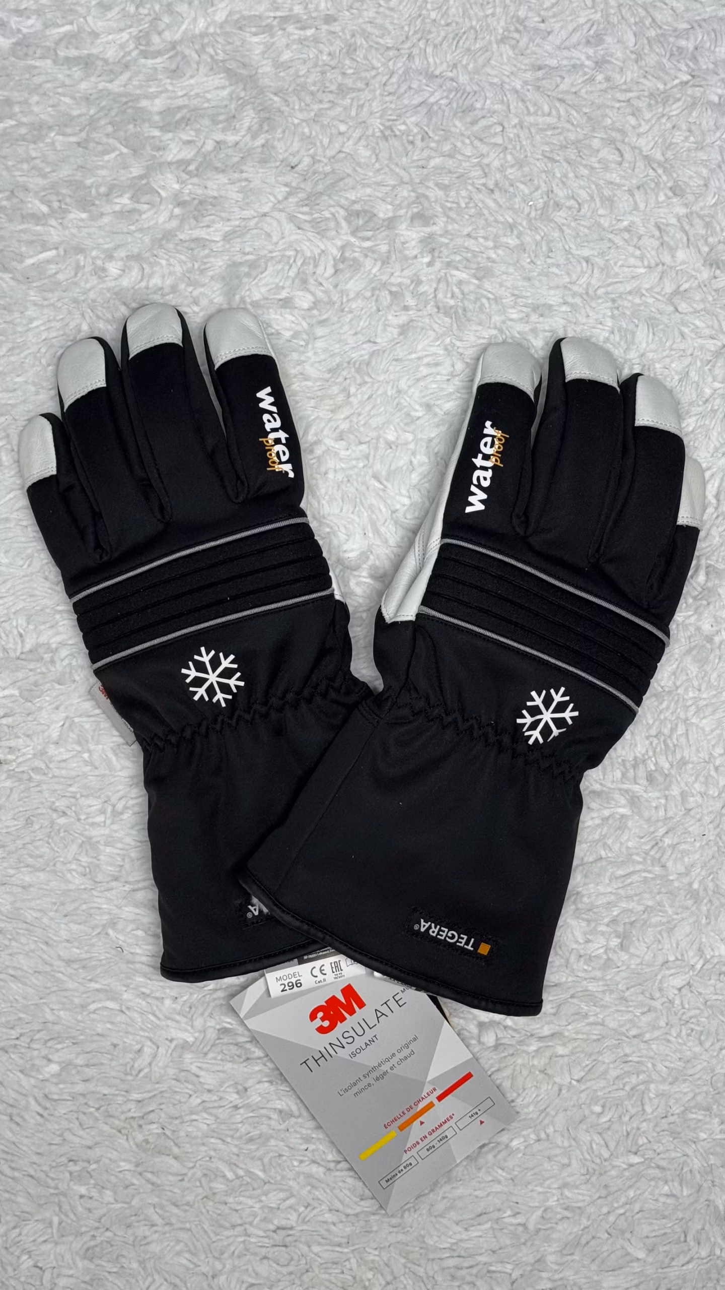 Water talvihanskat. Musta-valkoiset sormikkaat, joissa tekstiilipinta ja vahvistetut kämmenosat. Hanskoissa on lumihiutalekuvio ja ranteessa kuminauhakiristys. Sisäpuolella on pehmeä vuori. Soveltuvat kylmän sään ulkoiluun.